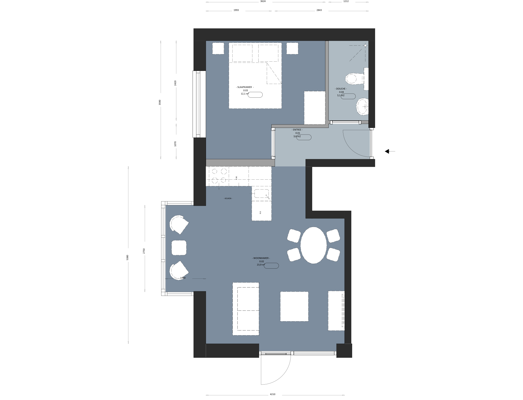L-vormige open keuken met kookplaat, vaatwasser en koelkast